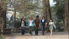 | Later, the gang apologize to Chiaki. Chiaki says everything is alright. Ryu thinks that Chiaki is placating him and asks him to hit him. They scuffle and then actually get in each other's faces. | Takeru gets in between them and says they get along so well that they feel comfortable feeling. They both laugh and everyone runs after Takeru and walk alongside him in victory. |