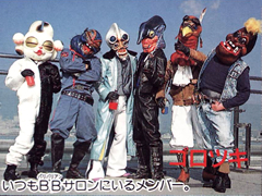 These are the denizens and solicators of the BB Saloon in the Baribarian, who are all members of the Bowzock. The one to the right is JJ Jetton, the two to the right and the turkey were the Zokurangers in episode 25. They continued to occupy the saloon and help the Bowzock in any way they could. |